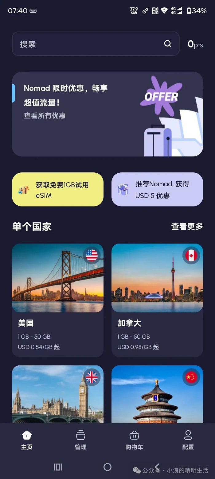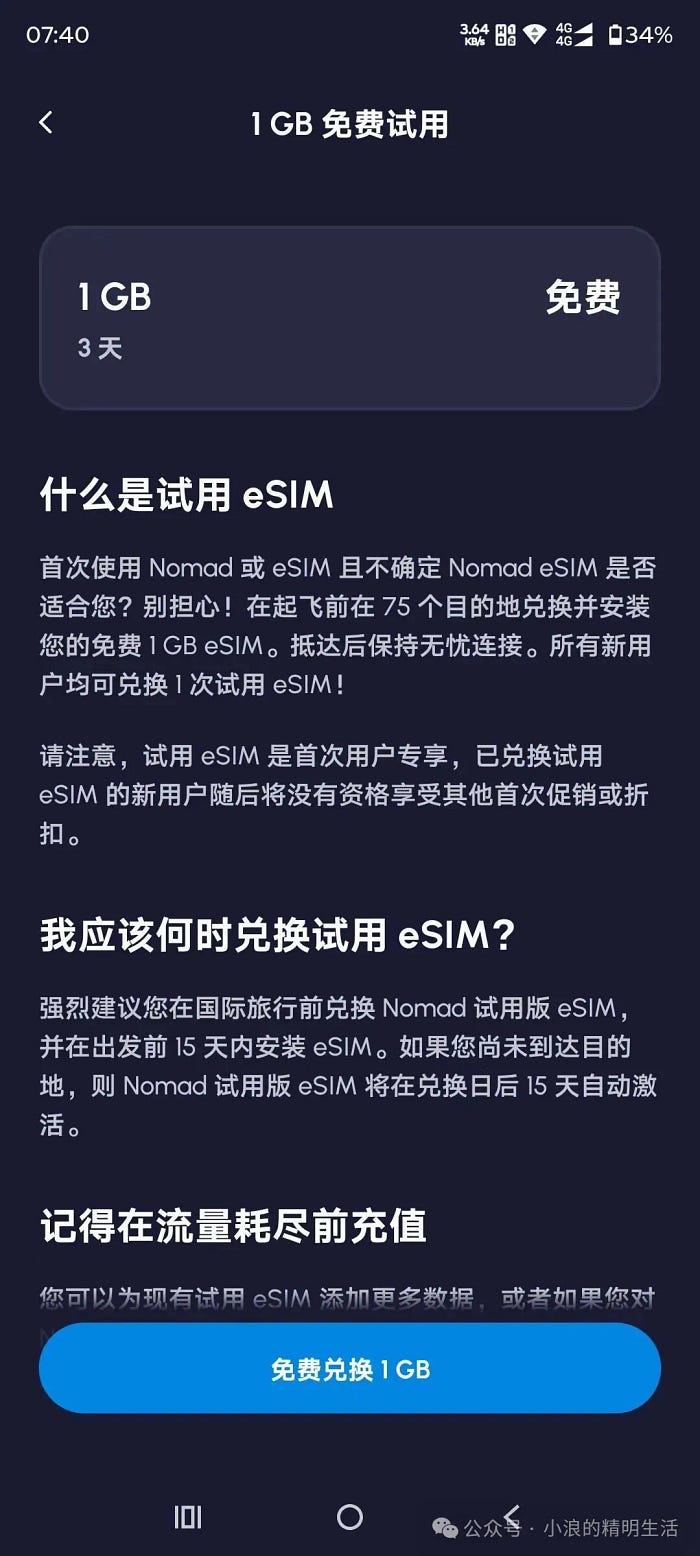 好吧,我没注册上,那我后续找了另外一家,Nomad这家,这家给的流量是免费体验1GB,但是只有3天有效期。