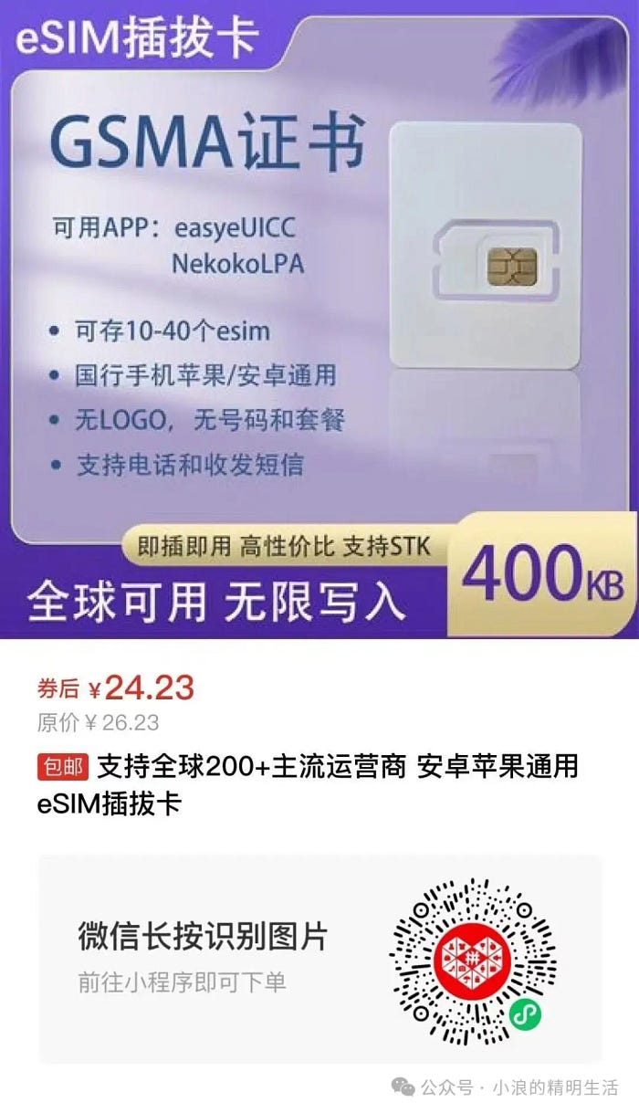 很多朋友会问,这个白卡可以写入多少张eSIM的数据,是这样的,25元钱的大约400多KB,按照10KB来计算的话,你大约能写入20–30张,有一些eSIM的数据比较大。