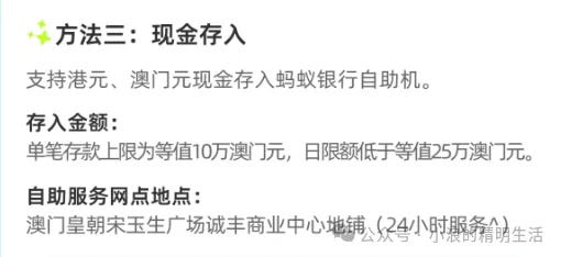 娱乐场不是本文主题。反正澳门这个城市吧,之前有人在网上问,我带2万块钱能在澳门玩几天,有人在下面回复说,有可能不仅不花钱还带钱回来,也有可能1日游。澳门毕竟是赌城,赌博不是光彩的事儿,还是别赌博为好。也就是因为娱乐场众多,为了吸引客人,所以羊毛不断。今天说的羊毛不是娱乐场的,我们不参与任何赌博,也可以不进入娱乐场也能完成羊毛,而且给的比娱乐场还多。澳门我是进进出出不少次了,上次还特地体验了一下琴澳签注,可以不限次进出7天,无限次往返。琴澳签注,真的是无限往返澳门神器澳门合法换钱场所我办了个7天无限往返澳门的签注直入主题就是:澳门现在开了一家蚂蚁银行,蚂蚁银行是支付宝的母公司蚂蚁集团旗下的,具体的名称是叫蚂蚁银行(澳门),有括号,因为香港也有。不过澳门这边的福利更好,毕竟这是澳门第一家,也是目前唯一一家虚拟银行。虚拟银行一般手续费都比实体银行便宜,但是弱点就是没有ATM机器可以存款。不过澳门这家很好,他有服务网点,服务网点24小时开放,你可以进行现金存取。