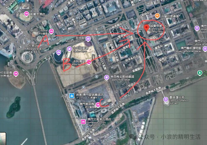 地理位置不错,我在图上画了几个重要的位置。A=新葡京,B=澳门永利,C=澳门美高梅。这是最核心的区域了。都很近。