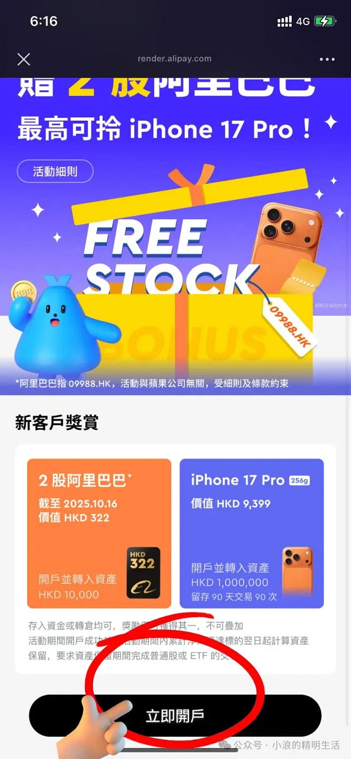 1.开户并转入资产1万港币,送2股阿里巴巴,预估价值322港币
