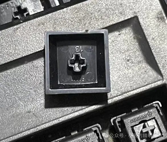 我发现,樱桃键盘这点很好,第一,上面2个边缘是不一样的,下面的是斜角,上方是正直线的角度;第二,背面是有数字编号,但是这个编号估计是别的意思,例如上图这个,这样翻转是正面。