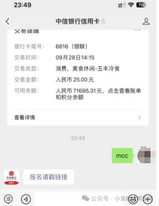 然后打开中信银行信用卡的微信公众号,输入MCC,大小写我不知道是否敏感,你像我这样输入。
